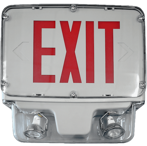 This hazardous led exit and emergency unit has different mounting options including surface/wall mount (standard) and pendant mounts. Housing is fiberglass reinforced polycarbonate construction in gray finish.
